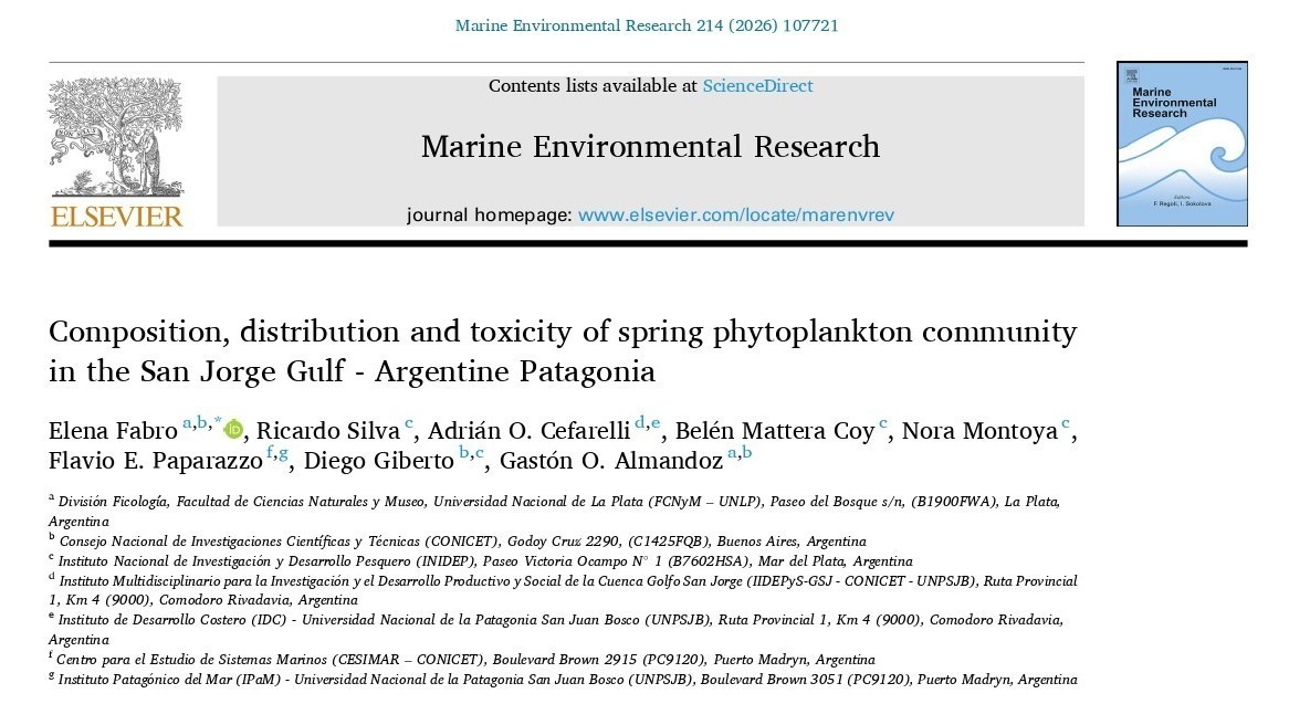 La publicación, titulada "Composition, distribution and toxicity of spring phytoplankton community in the San Jorge Gulf - Argentine Patagonia", estuvo liderada por la Dra. Elena Fabro, del Museo de La Plata y se encuentra disponible en Marine Environmental Research: